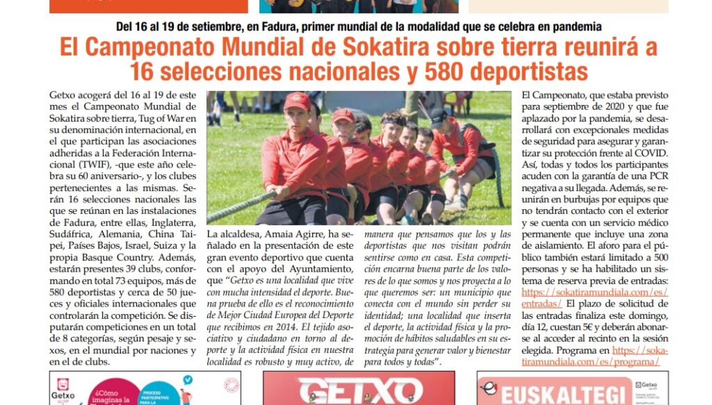 Si hace unos días nos hacíamos eco de las lamentables condiciones e instalaciones en las que entrena el equipo local de Sokatira de Getxo a las puertas del Mundial que acogerá Fadura del 16 al 19 de septiembre, en el último número del periódico municipal nos encontramos con una noticia sobre el evento que viene acompañada de una fotografía del equipo de Sokatira de Laukiz, a pesar de existir en el municipio un equipo local.