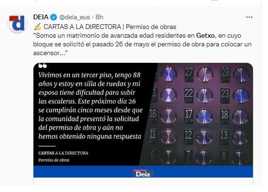 En la sección de Cartas al Director del Diario Deia un matrimonio de avanzada edad residente en Getxo ha denunciado que llevan cinco meses esperando el permiso de obra del Ayuntamiento de Getxo para colocar un ascensor en el bloque de viviendas donde viven.