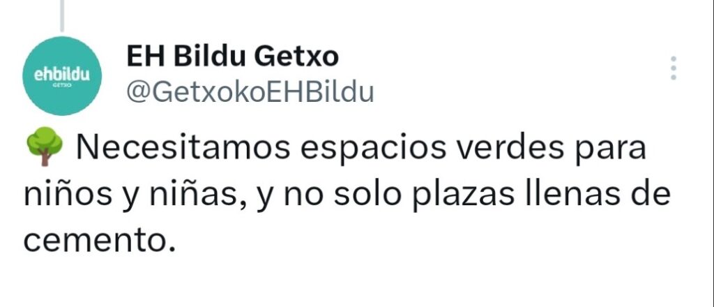 Es por ejemplo el caso de Eh Bildu, que se autoproclama defensor de los espacios verdes y contra la presencia de parques llenos de cemento a pesar de haber votado hace solo unos meses en el Pleno municipal en contra de una moción del PP de Getxo para transformar la céntrica plaza de Biotz Alai de Algorta en un gran pulm´ón verde de 1.400 metros cuadrados. La propuesta de los populares venía a poner fin a la existencia de una explanada de hormigón con el objetivo de naturalizar la zona, entre otras cuestiones.