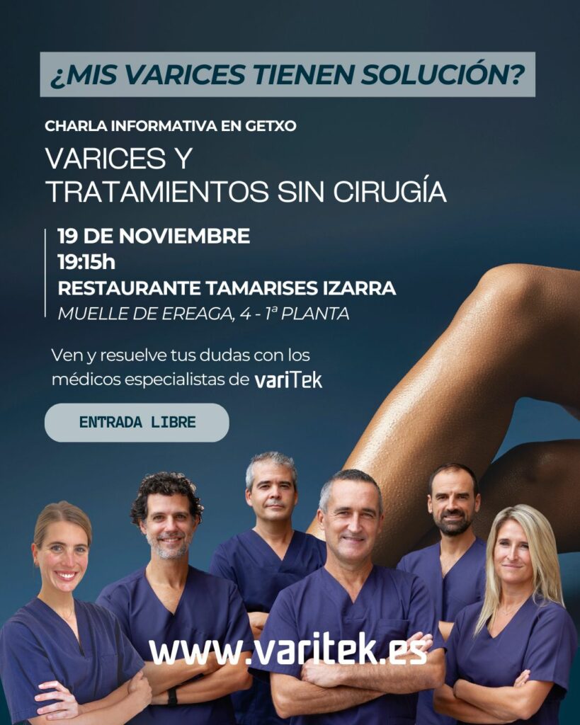 Este próximo miércoles, 19 de noviembre, a las 19:15 horas en el Tamarises Izarra, con entrada gratuita, se dará cita el equipo de médicos radiólogos intervencionistas de Varitek, con más de 20 años de experiencia en Osakidetza y más de 10 tratando varices sin cirugía.