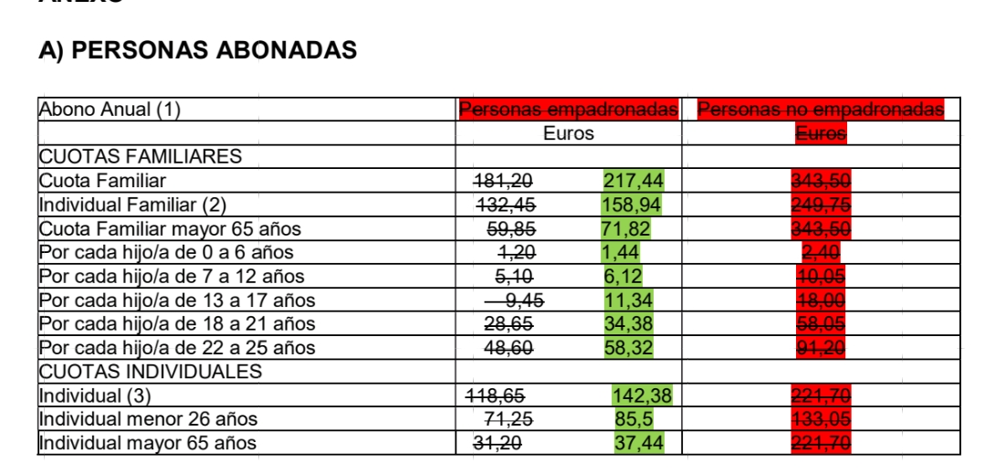 De acuerdo con los datos facilitados por el PP, la cuota familiar ordinaria pasará de 181,20 euros a 217,44 euros anuales, lo que supone un incremento de 36,24 euros al año. Por su parte, la cuota individual aumentará de 118,65 euros a 142,38 euros, es decir, 23 euros más al año.