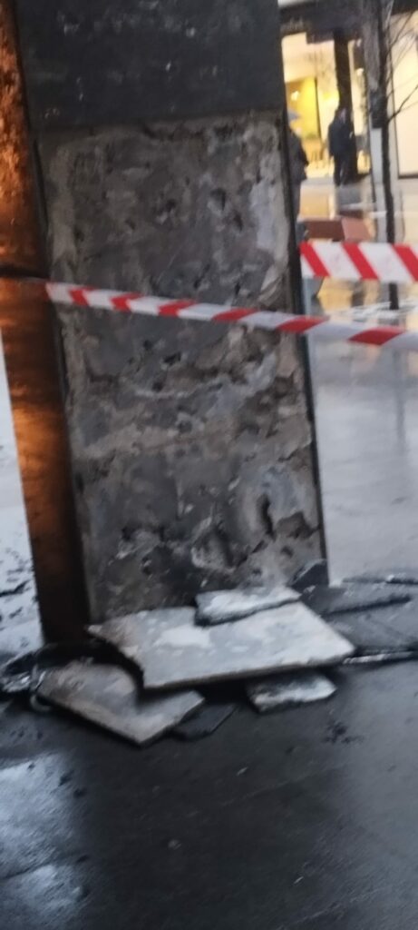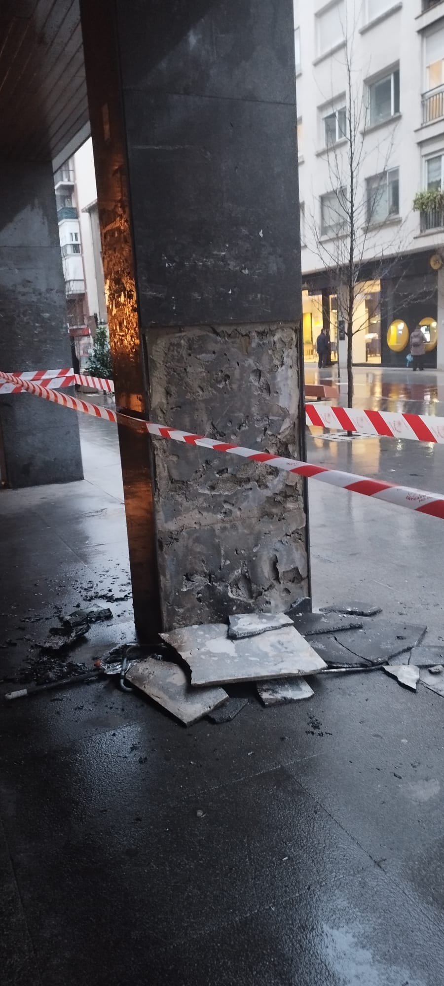 El calor generado por las llamas ha afectado directamente a la estructura exterior del soportal, causando la caída de varias piezas de revestimiento de mármol. La zona ha sido acordonada.